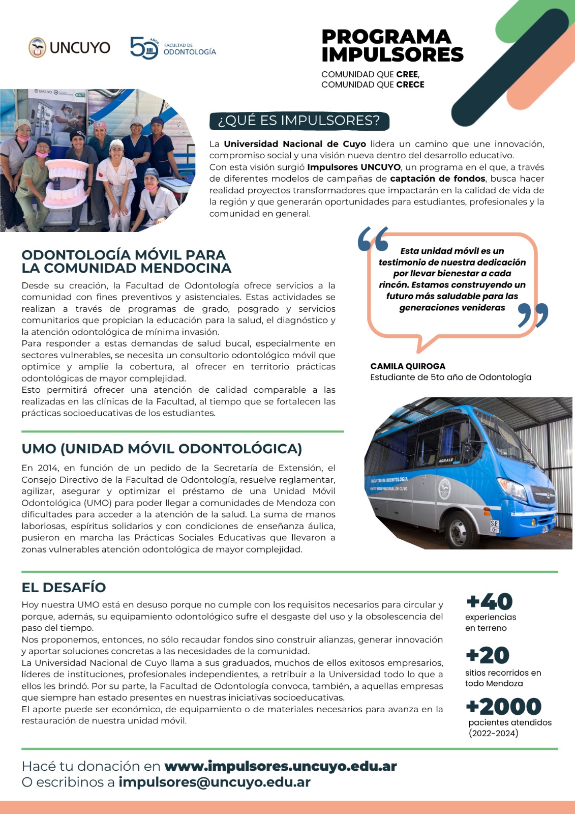 Además de su impacto asistencial, el proyecto ofrece una instancia educativa clave para la formación integral de los futuros odontólogos, quienes podrán desarrollar prácticas clínicas en contextos reales y diversos, fortaleciendo competencias técnicas y sensibilidad social.