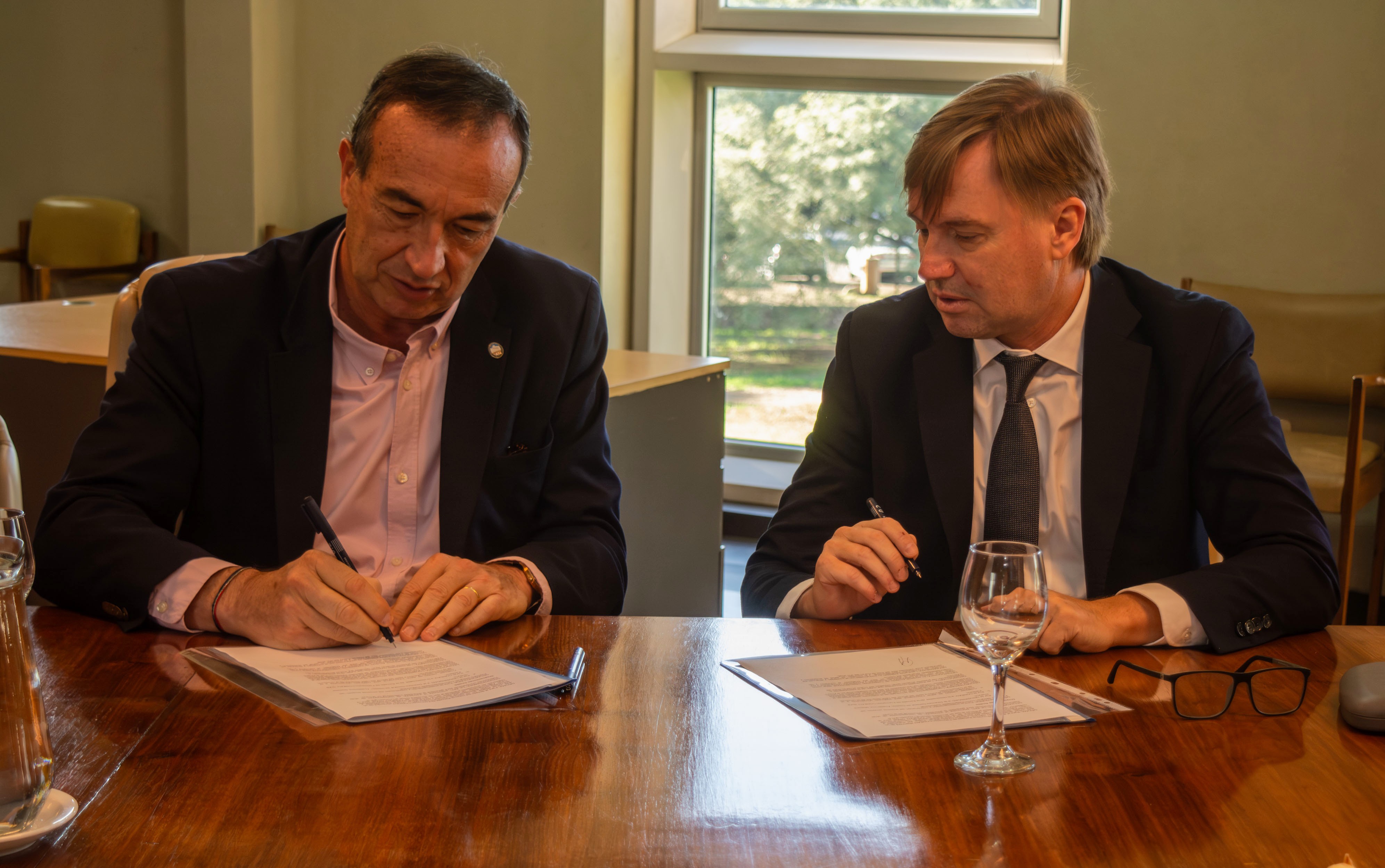 Gabriel Fidel y Martín Strah durante la firma del acuerdo de cooperación interinstitucional para la implementación de la capacitación.