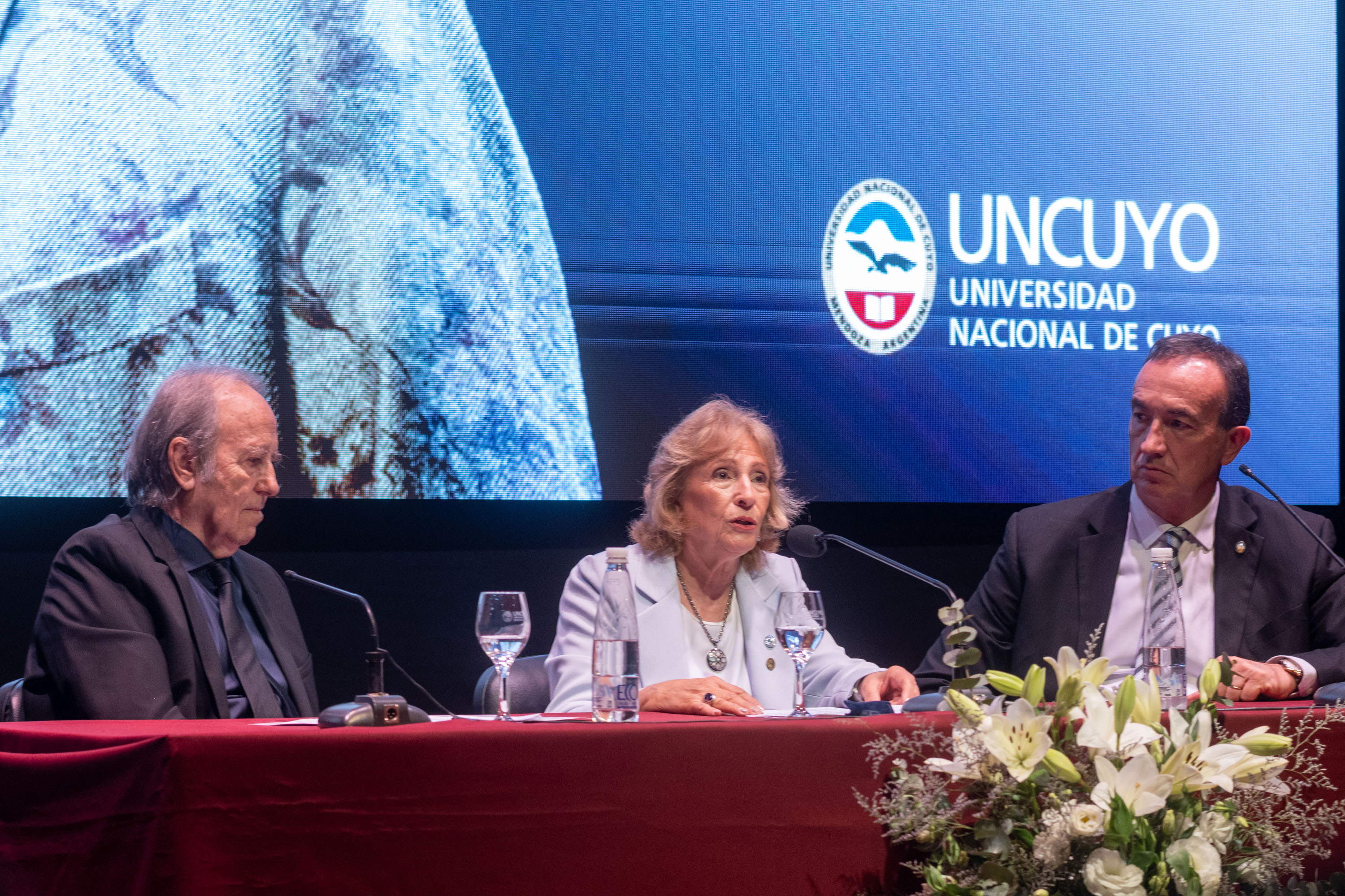 La rectora de la UNCUYO, Esther Sanchez fue la responsable de entregarle el título y la medalla al nuevo doctor Honoris Causa de la UNCUYO, mientras que el vicerrector Gabriel Fidel otorgó la resolución y el regalo institucional.