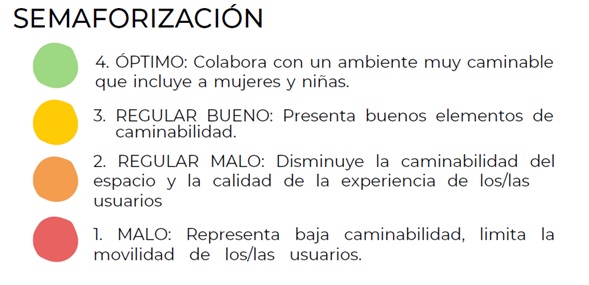 La herramienta aplicada trabaja con cuatro categorías de puntaje, según la medida en que favorecen o, por el contrario, impiden la circulación a pie de manera confortable.