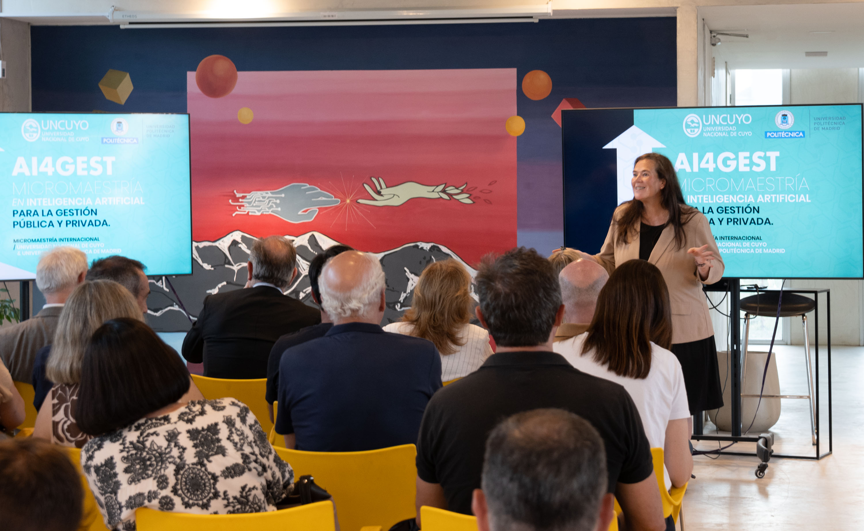 La secretaria de Investigación, Internacionales y Posgrado de la UNCUYO, Teresa Damiani, explicó que este lanzamiento responde al trabajo que se realiza desde hace más de un año con la Universidad Politécnica de Madrid: "Vamos a otorgar el título en forma asociada, es una doble titulación internacional y la idea es tomar toda la experiencia que los españoles tienen con un máster que se llama AI4Gov que diseñaron precisamente para funcionarios de gobierno".