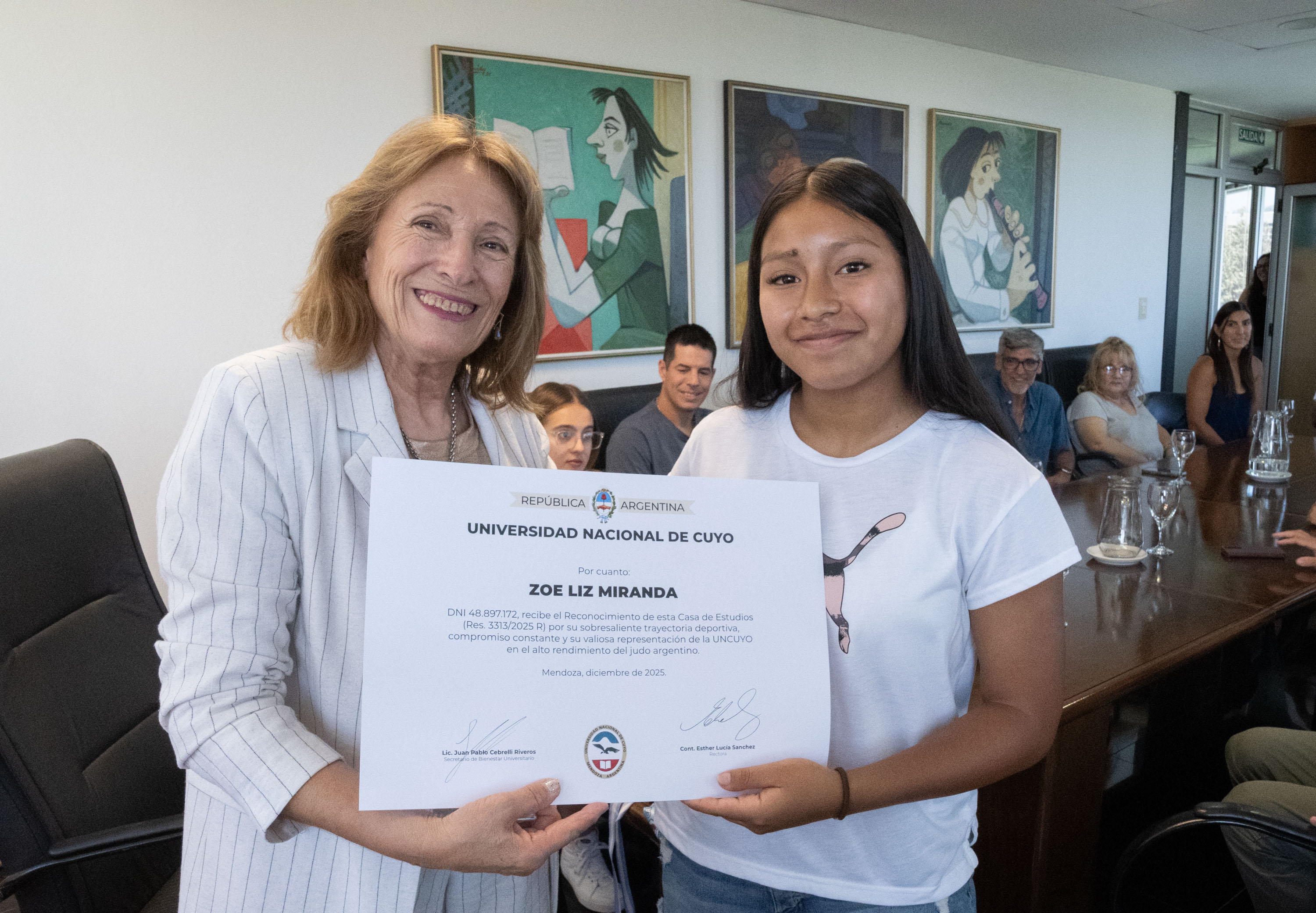La Universidad Nacional de Cuyo (UNCUYO), a solicitud de la Secretaría de Bienestar Universitario (SBU), entregó un reconocimiento institucional a dos destacadas deportistas del CLUB UNCUYO. La rectora Esther Sanchez, junto a autoridades de la SBU, recibió en su despacho a Milagros Alastra, reciente subcampeona mundial sub 21 con Las Leonas y elegida la mejor jugadora juvenil del mundo, y Zoe Miranda, campeona de torneos nacionales e integrante de la Selección Argentina de Judo.
