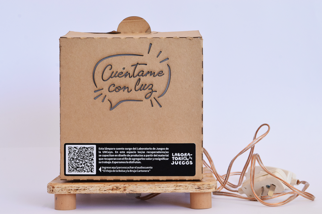 Es un producto que surge del proyecto del Laboratorio de juegos, un espacio de aprendizaje y co-construcción entre el Programa ESA de la SEU de la UNCUYO y organizaciones de recuperadores/as urbanos de Mendoza. Es una lámpara-cuento elaborada con materiales reciclables. Contiene un QR para acceder al audio de los cuentos: El Viejo de la Bolsa, La Bruja Cartonera y La sabiduría del campo: el deseo de Eluney. Está diseñada en forma de cubo y en cada uno de sus lados ilustra las principales escenas del cuento.