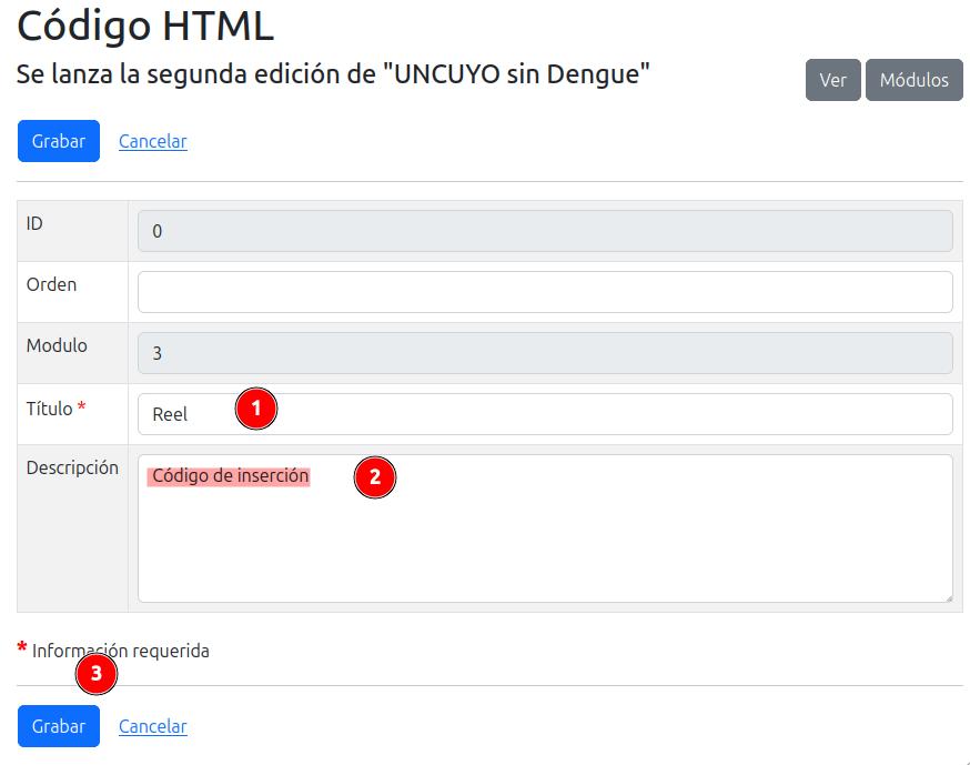 Para incluir el módulo de código, se realizan los pasos sugeridos en "Módulos de Contenido".